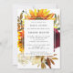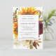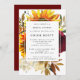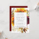 Dramatique et élégante invitation à la douche nuptiale comprend des fleurs d'automne et feuillage d'automne. L'arrangement floral d'automne contient des tournesols jaunes dorés, des roses rouges foncés, des pivoines violettes et des fleurs blanches d'hydrangée. Les feuilles verdoyants et oliviers accentuent l'ambiance automnale. La Botanique Boho moderne est très populaire cette saison. Le texte gris de colombe molle fournit les détails de la douche nuptiale. Cette invitation à la douche nuptiale fait partie de la collection Sunflower et Bourgogne. Il dispose des modèles dont vous avez besoin pour créer une douche nuptiale unique que vos invités n'oublieront pas !
