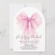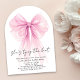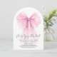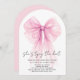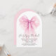 Charmant appel de douche nuptiale en arc avec une belle aquarelle d'un grand arc de coquette rose, "elle attache le noeud" dans un script chic, le nom de la mariée et les détails de l'événement en lettres modernes simples.