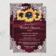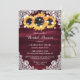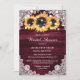 Belles invitations à la douche nuptiale bordeaux et tournesol rustique avec fleurs de tournesol et dentelle fleurie blanche contre arrière - plan de bois rustique. Éléments correspondants disponibles.