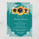 Elégante invitation à la douche nuptiale de tournesol rustique turquoise avec des tournesols sur un arrière - plan turquoise orné de dentelle fleurie blanche et de lampes à cordes. Éléments correspondants disponibles.