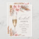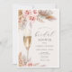 Cette invitation boho rustique à la douche nuptiale comprend un arrière - plan en ivoire avec de l'herbe de pampas neutre, des fleurs séchées, des roses douces et roses roses et une coupe de champagne pétillante.