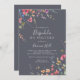 Cette invitation classique à la douche nuptiale espagnole à fleurs sauvages bleues est parfaite pour un wedding shower rustique. Le design présente des fleurs sauvages jaunes, violettes et blanches avec du feuillage dans un arrière - plan rose et vert aquarelle.