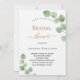 Un arrière - plan blanc décoré de sprigs de verdure d'eucalyptus. Personnalisez et le nom de la mariée à être et les détails du parti. Lettres noires et dorées. Retour : arrière - plan vert.