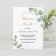 Un arrière - plan blanc décoré de sprigs de verdure d'eucalyptus. Personnalisez et le nom de la mariée à être et les détails du parti. Lettres noires et dorées. Retour : arrière - plan vert.