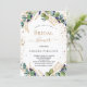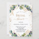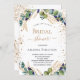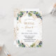 Un arrière - plan blanc décoré de verdure d'eucalyptus et de feuilles dorés et de poussière de parties scintillant en faux or. Personnalisez et la mariée pour être le nom et les détails du parti. Lettres noires et dorées. Dos : arrière - plan blanc avec poussière de parties scintillant en faux or.