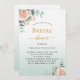 Arrière - plan de dégradé vert et blanc. Décoré d'or rose et de fleurs roses rousses, de fleurs roses et de feuilles d'eucalyptus vert couleur eau, de sprigs, de verdure et de sprigs faux or. Personnalisez et ajoutez le nom de la mariée à être et les détails du parti. Lettres noires et dorées. Dos : vert et blanc dégradé couleur arrière - plan.