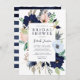 Cette invitation à la douche nuptiale fleurie sur le thème de la plage nautique présente des fleurs d'aquarelle bleu marine peintes à la main et rose avec une verdure accentuée par l'étoile d'or. Personnalisez avec les détails de votre fête dans la typographie de script faux bleu moderne. Le dos de la carte a une texture d'aquarelle rayée bleue et blanche. Conçu par Susan Coffey.