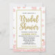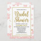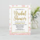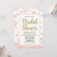 Cette invitation à la douche nuptiale fleurie moderne comprend un arrière - plan à fleurs roses avec des éclaboussures de parties scintillant dorée. Le texte est écrit dans un mélange d'une police calligraphique ludique et d'une police sans police moderne.