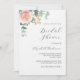 Un arrière - plan blanc chic. Décoré d'or rose et de fleurs roses rousses, de fleurs roses et de feuilles d'eucalyptus vert aquarellés, de sprigs, de verdure et d'une fausse feuille d'or. Personnalisez et ajoutez le nom de la mariée à être et les détails du parti. Dos : or rose couleur arrière - plan.