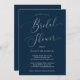 Elégante et minimaliste invitation à la douche nuptiale avec script moderne sur un arrière - plan bleu marine.