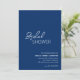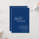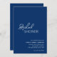 Une invitation à la douche nuptiale bleu marine moderne avec un design simple et minimal avec le titre de l'événement dans un script élégant et une police sans serif contemporaine. Vous trouverez ci-dessous, dans le coin inférieur droit, les détails de votre événement dans un agencement minimaliste.
