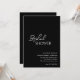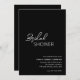 Invitation de douche nuptiale noire moderne avec un design simple et minimal avec le titre de l'événement dans un script élégant et une police sans serif contemporaine. Vous trouverez ci-dessous, dans le coin inférieur droit, les détails de votre événement dans un agencement minimaliste.