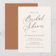Invitations amis et la famille pour pomper la future mariée avec ce faire-part de mariage simple, avec des couleurs chaudes et un magnifique script sur le devant, et un arrière - plan orange brûlé.