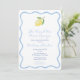 Ce design de fête de Fête des mariées fait partie d'une nouvelle collection basée sur ma gamme d'invitations au citron "Amalfi" populaire. L'invitation est descendu, avec une bordure ondulée, un simple citron avec des feuilles et un revers de tuiles peintes à la main bleu et blanc.