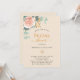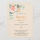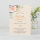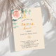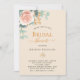 Arrière - plan beige. Décoré d'or rose et de fleurs roses rousses, de fleurs roses et de feuilles d'eucalyptus vert aquarellés, de sprigs, de verdure et d'une fausse feuille d'or. Personnalisez et ajoutez le nom de la mariée à être et les détails du parti. Lettres noires et dorées.