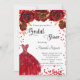 Une invitation à la Fête des mariées moderne, élégante et glamour. Un arrière - plan blanc aux étincelles, une robe rouge et des roses rouges, des fleurs. Le nom est écrit avec un script de style moderne écrit à la main. Personnalisez et ajoutez les détails de votre fête.
