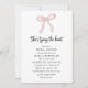 Vous êtes invités à célébrer la future mariée avec notre simple coquette rose "Elle attache le noeud" invitation à la douche nuptiale ! Avec son coquette rose pâle, cette invitation chic et féminine donne le ton parfait pour une journée d'amour, de rire et de célébration. Fêtons les futurs mariés et trinquons à l’amour et au beau voyage à venir !
