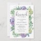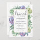 Une douche nuptiale est une invitation idéale pour un brunch ou un déjeuner avec des succulents d'aquarelle dans les tons vert et violet, des feuilles d'eucalyptus et des branches botaniques avec une bordure d'accent or. Customisez avec vos informations pour que la mariée soit mariée. Cliquez sur "cliquer pour customiser plus loin" pour modifier le style, la taille ou la couleur de la police.