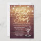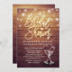 Modèles de la carte d'invitation à la douche nuptiale - Élégant script de lettrage en or, lunettes de champagne Vintages et lampes à cordes sur Arrière - plan en bois rustique. Tous Les Style De Texte, Couleurs, Tailles Peuvent Être Modifiés En Fonction De Vos Besoins.