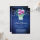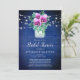 Ces invitations à la douche nuptiale ont une aquarelle violette calla lily et un feuillage avec bocal en maçon et lampes à cordes sur un arrière - plan en bois bleu marine. Produits correspondants disponibles. Visitez notre magasin pour voir la gamme complète de produits mariages et nuptiaux que vous pouvez personnaliser pour votre mariage.