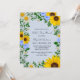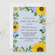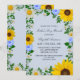 Invitation à la fête des mères rustiques avec des tournesols vibrants, des marguerites blanches traditionnelles et des fleurs bleues colorées contre un arrière - plan bleu clair et poussiéreux avec respiration pour bébé et des accents de verdure botanique