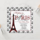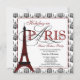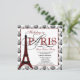 Élégantes invitations d'anniversaire pour les seize ans sur le thème de Paris en rouge, noir et blanc, avec des lustres et la Tour Eiffel.