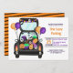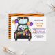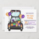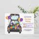 Trunk ou traiter la fête ! Célébrez votre Halloween éffrayant et vos amis invitations et votre famille à votre événement annuel avec cette jolie voiture dessinée à la main avec le coffre plein de bonbons d'Halloween, fantôme, bonbons, ballons, chauves-souris, araignées, citrouille en orange, violet.
