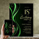 Invitation vos amis et proches avec cette invitation moderne de fête de 18e anniversaire en noir et vert. La zone de texte personnalisable de ce modèle d'invitation vous permet d'inclure sans effort tous les détails nécessaires à votre fête d'anniversaire, y compris la date, l'heure, le lieu et les informations RSVP. Une variété de types de papier et de styles d'angle sont disponibles pour vos invitations uniques, ainsi que l'option de téléchargement si vous préférez un format numérique.