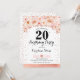 Invitation à la fête du 20e anniversaire. Design élégant en faux or rose parties scintillant avec accent floral. Carte Invitation avec police de script et confetti. Corail blanc rose, blanc. Parfait pour une trentième célébration anniversaire. Message-moi si vous avez besoin d'âge personnalisé.