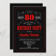 Invitation à la fête du 80e anniversaire. Design rétro noir, rouge et blanc élégant avec motif de tableau noir et police de script. Bravo à 80 ans ! Message-moi si vous avez besoin d'une personnalisation plus poussée.
