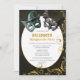 Invitation vos invités à une mascarade Halloween hanté avec cette magnifique invitation. Doté de masques effrayants, d'un arrière - plan fumé vert/bokeh, et de tourbillons de parties scintillant d'or. Cette invitation donne le ton parfait pour un événement amusant et mystérieux.