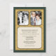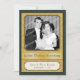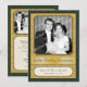 Célébrez ce couple spécial avec cette invitation de fête pour un Anniversaire de Mariage en Or. Leur photo est placée sur un fond à motif damassé or avec une bordure vert foncé. (Assurez-vous de remplacer cette image frontale par une photo grande et haute résolution). Leurs noms et date de mariage (ou tout autre texte) sont mis en évidence dans la plaque en dessous. Puis mettez-les en valeur tels qu'ils étaient alors et sont maintenant au dos avec toutes les informations sur l'événement ci-dessous. Disponible en couleurs alternatives avec des faveurs et un affranchissement assortis disponibles.