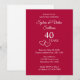 Personnalisez cette élégante et simple invitation pour une fête d'anniversaire de mariage de 40 ans en ajoutant les noms du couple et les détails de la fête. Mes cœurs entrelacés conçus à l'origine mettent en valeur l'inscription moderne et stylisée "40 Ans". Personnalisez cette carte rouge rubis avec une typographie tendance pour vos besoins. Vous pouvez également modifier le nombre pour un anniversaire de mariage personnalisé de 25 ans, ou pour un 10e anniversaire de mariage, 50e ou 60e anniversaire de mariage ou tout autre anniversaire. Ce serait une invitation de fête d'anniversaire de mariage romantique et charmante. Consultez ma collection pour une décoration de table et de la verrerie de mariage assorties, rouges rubis, pour un 40e anniversaire de mariage.