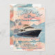 Cartes d'invitation pour la fête "Rock the Yacht Boat". Présente un yacht privé glamour avec un fond d'île tropicale au coucher du soleil en aquarelle. Parfait pour une fête sur l'eau ! Idéal pour une fête de croisière pour un enterrement de vie de jeune fille, des fiançailles, un yacht rock avec karaoke, une aventure de week-end ou une célébration d'anniversaire. Tout le texte peut être modifié pour répondre à nos besoins. Couleurs de corail et d'aqua ravissantes. Pour apporter d'autres modifications, allez sur "Personnaliser ce modèle". En bas, vous verrez "Voulez-vous personnaliser encore plus ce design ? Cliquez sur MODIFIER en utilisant l'outil de conception. À partir de là, vous pouvez changer certaines polices et certaines couleurs, déplacer des éléments ou supprimer ce dont vous avez besoin. Un peu de contenu génératif de mi-parcours