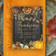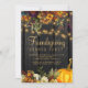 De magnifiques fleurs d'automne orange rouille et bordeaux foncé et bordures de citrouilles avec des guirlandes de lumières scintillantes dorées sur un fond en bois de grange brun foncé créant une invitation à un dîner de Thanksgiving friendsgiving charmante avec une typographie dorée à l'écriture manuscrite tendance. +++++++++ Facile à personnaliser avec vos détails ! Convient aux rassemblements traditionnels rustiques | campagnards | de ferme | de plein air dans la cour arrière avec la famille et les amis.