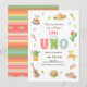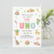 Pas le temps de faire la sieste, c'est une fiesta ! Cette amusante invitation de premier anniversaire présente des illustrations aquarelles d'objets de fêtes comme des sombreros, des tacos et des vêtements. L'UNO est une police à motifs mexicains en rouge pastel, vert et bleu. L'arrière de l'invitation est la version moderne d'un tissu serape classique.
