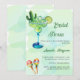 Un arrière - plan vert aquarellé décoré de cactus aquarellés, un grand verre vert et bleu avec un cocktail Margerita, des maracas colorés Personnalisez et le nom de la mariée à être et les détails.