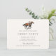 Invitation moderne de fête de derby de course de chevaux avec une illustration d'un cheval de course avec jockey et motif rayé sur le dos. Tous les éléments de texte peuvent être modifiés afin que ce design puisse être utilisé pour d'autres événements également : invitation de mariage équestre chic, fête d'anniversaire de cheval, fête de visionnage de derby, ouverture de manège et plus encore. Le fond, la couleur de l'illustration et les couleurs du texte peuvent être modifiés à l'aide de l'outil de conception !