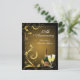 Invitation personnalisée élégante pour un anniversaire de mariage de 50 ans ou toute autre année. De belles invitations festives présentent un design noir et or avec un motif tourbillonnant élégant et deux verres de champagne pétillant avec une bouteille de champagne teintée verte pour célébrer le grand jour des invités d'honneur.