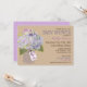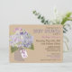 Carte d'invitation de fête prénatale rustique avec hydrangeas lavande dans un pot de brique avec une étiquette "Fille" sur fond de lin.