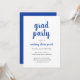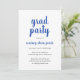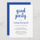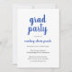 Une simple invitation à la fête de remise de diplômes avec un design classique avec "grande fête" et le nom du diplômé dans une épaisse écriture bleue manuscrite sur un arrière - plan blanc. L'arrière est bleu dur. Une invitation élégante avec une touche minimaliste moderne pour une jeune diplômée.