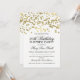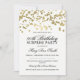 Invitation élégante pour une fête surprise de 90e anniversaire avec motif de confetti en feuille d'or (CE N'EST PAS UNE FEUILLE D'OR RÉELLE) sur fond blanc, nom et date personnalisés et texte supplémentaire.