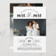 Faire-part de mariage de suite gay en blanc avec polices noires et votre photo mariage. Dans un arc au-dessus de mrs et mrs liés aux coeurs entrelacés, fêtez avec le nouveau. Ajoutez ci-dessous les détails de la fête des mariages et une autre photo mariage de l'autre côté. Invitation de mariage lesbienne en blanc et noir personnalisée avec vos photos mariages. L'invitation à célébrer la fête de Mme & Mme post elopement personnalisée avec deux photos.