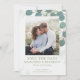 Carte d'annonce de mariage à l'aquarelle élégante avec feuillage d'eucalyptus, recto-verso. Avec des feuilles de feuillage d'eucalyptus à l'aquarelle. Ce modèle de conception présente une mise en page avec une photo.