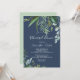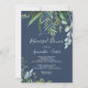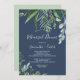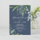 Cette invitation de dîner de répétition de mariage naval estival est parfaite pour une répétition de mariage élégante en plein été. Le design botanique présente une disposition luxuriante d'eucalyptus aquarelle peinte, de feuillage et de feuilles vertes sur un fond bleu marine.