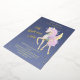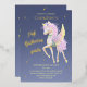 Invitation pour le 1er anniversaire avec une licorne délicate avec des ailes, des étoiles et des lettres en feuille d'or.