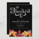 Carton d'invitation noir avec feuilles aquarelles colorées et écriture blanche "Thankful".