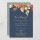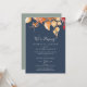 Cette carte de réception de mariage intime bleu marine avec feuilles d'automne est parfaite pour une fête post-mariage intime en octobre. Le design rustique moderne présente de superbes feuilles d'automne peintes à l'aquarelle dans des nuances colorées de jaune, d'orange brûlé et de rouge bordeaux qui ressortent sur un fond bleu marine. Les cartes de RSVP sont vendues séparément.