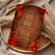 Un design chaleureux et accueillant avec un fond en bois naturel encadré par des feuilles d'automne vibrantes et des accents saisonniers. La composition mélange des textures rustiques avec des tons orange et rouge riches, créant un style visuel cosy et organique. Les éléments naturels et la palette terreuse évoquent une atmosphère intemporelle et charmante.
