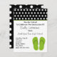 Un invitation de fête d'anniversaire avec une bordure noire avec des pois blancs au sommet avec une garniture verte. Illustration d'une paire de tongs verts en bas à droite. Personnalisez le texte noir avec les détails de votre occasion. Le côté opposé est noir avec des points blancs. Recherchez les envois et les étiquettes de adresse correspondants chez Jill's Paperie.